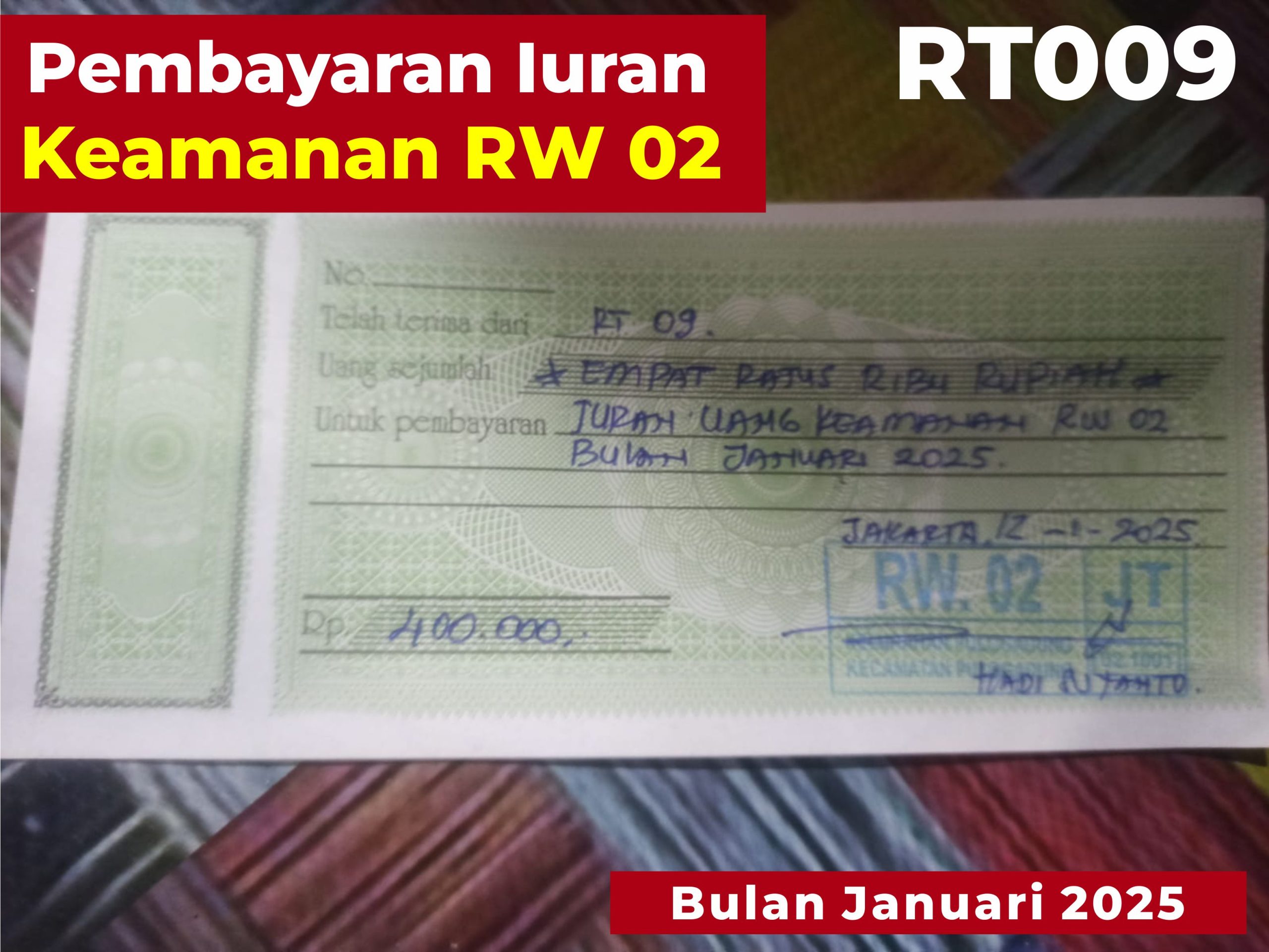 Pada tanggal 12 Januari 2025, pengurus RT 009 RW 02 Pulo Gadung telah menyelesaikan kewajiban pembay