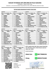 RT.009/02, Pulogadung – Menindaklanjuti himbauan dari Kelurahan Pulogadung Nomor 48/PU/04.00, warga RT.009/02 telah menyusun jadwal kegiatan sistem keamanan lingkungan (Siskamling) selama bulan Ramadan 1446 H. Kegiatan ini berlangsung mulai 28 Februari hingga 6 april 2025 sebagai upaya menjaga keamanan dan ketertiban di lingkungan sekitar selama bulan suci.